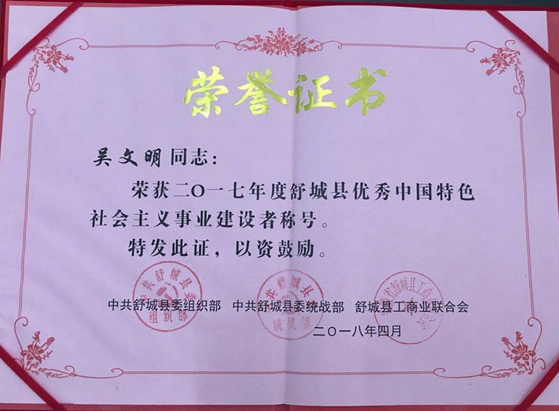 熱烈祝賀我公司董事長吳文明先生榮獲“2017年度舒城縣優(yōu)秀中國特色社會主義建設(shè)者”稱號。